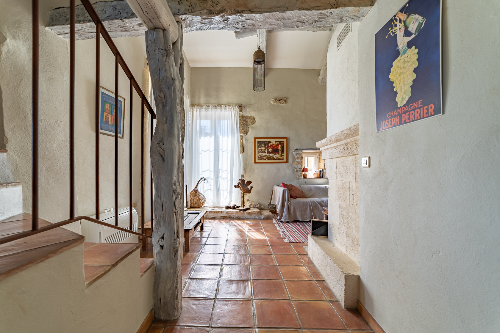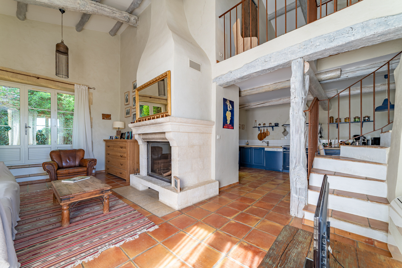 On accède à l'habitation par un joli escalier en pierres, on arrive sur le niveau principal de la maison comprenant d'un côté une cuisine équipée haut de gamme et un salon lumineux avec une cheminée monumentale.