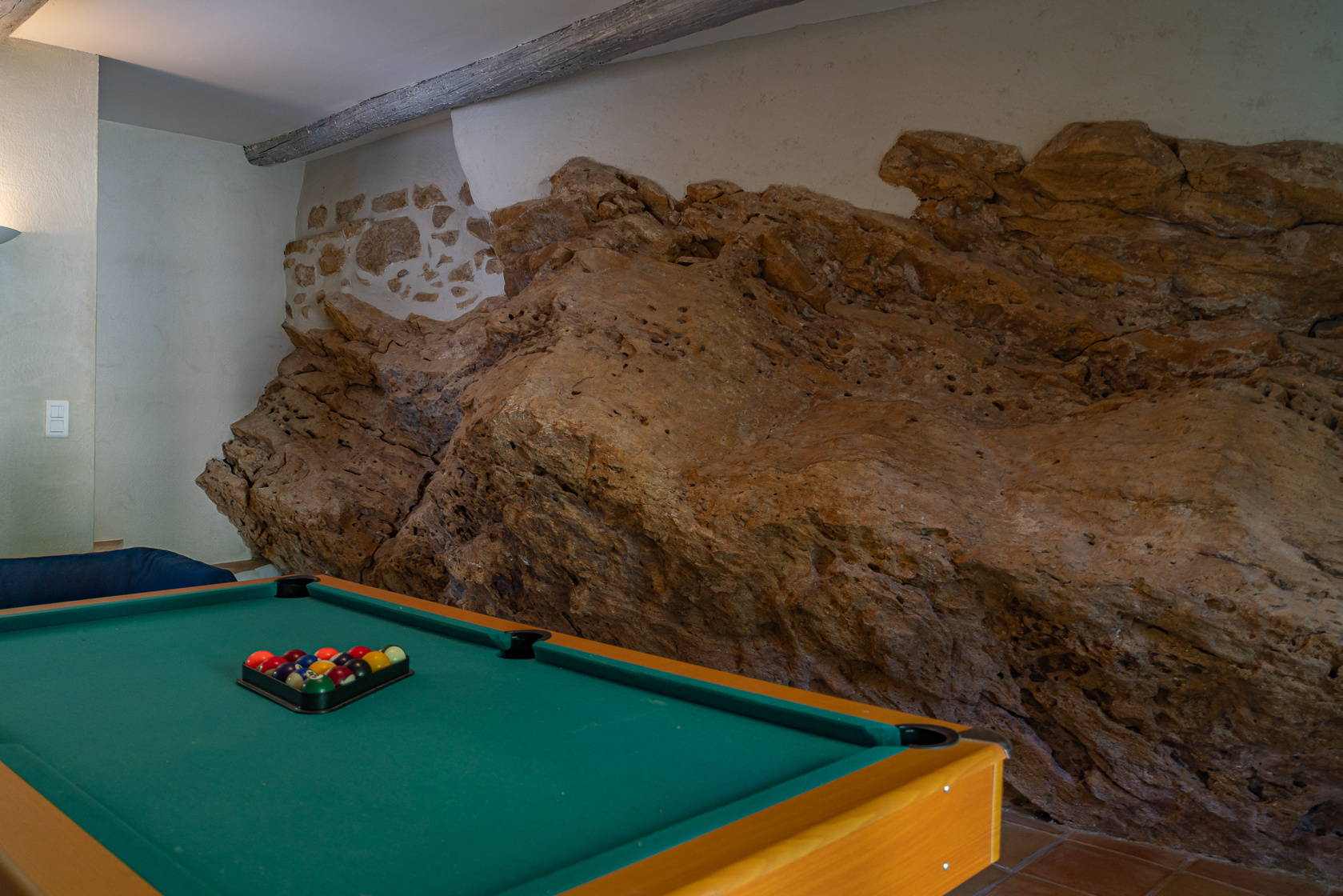 L'autre partie de la maison est une véritable surprise et l'effet "Waouh" sera là coup sûr avec l'espace billard et le rocher affleurant dans la pièce qui pourrait devenir un second salon.