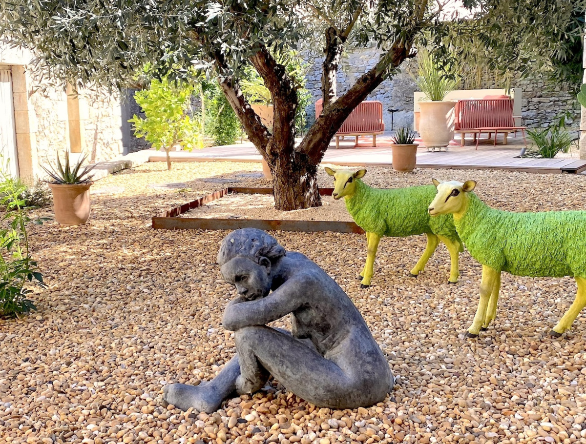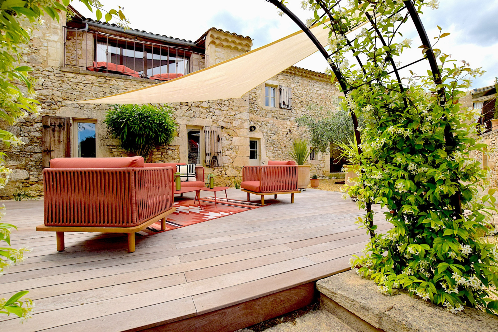 Le jardin, conçu pour un minimum d'entretien, avec des terrasses abritées par des voiles aériens.