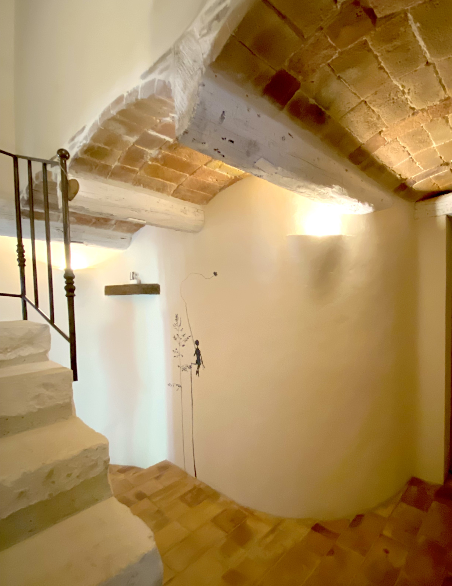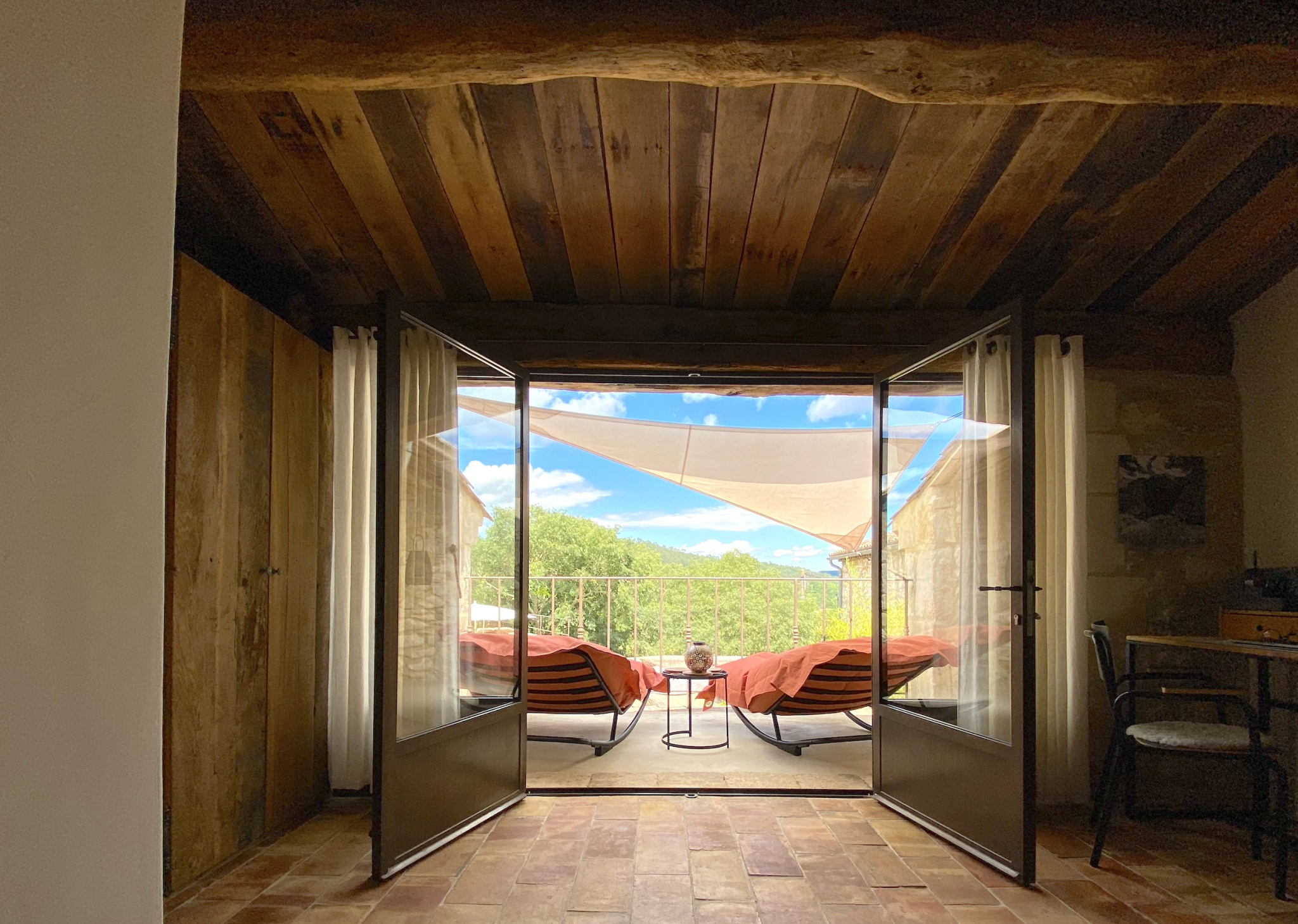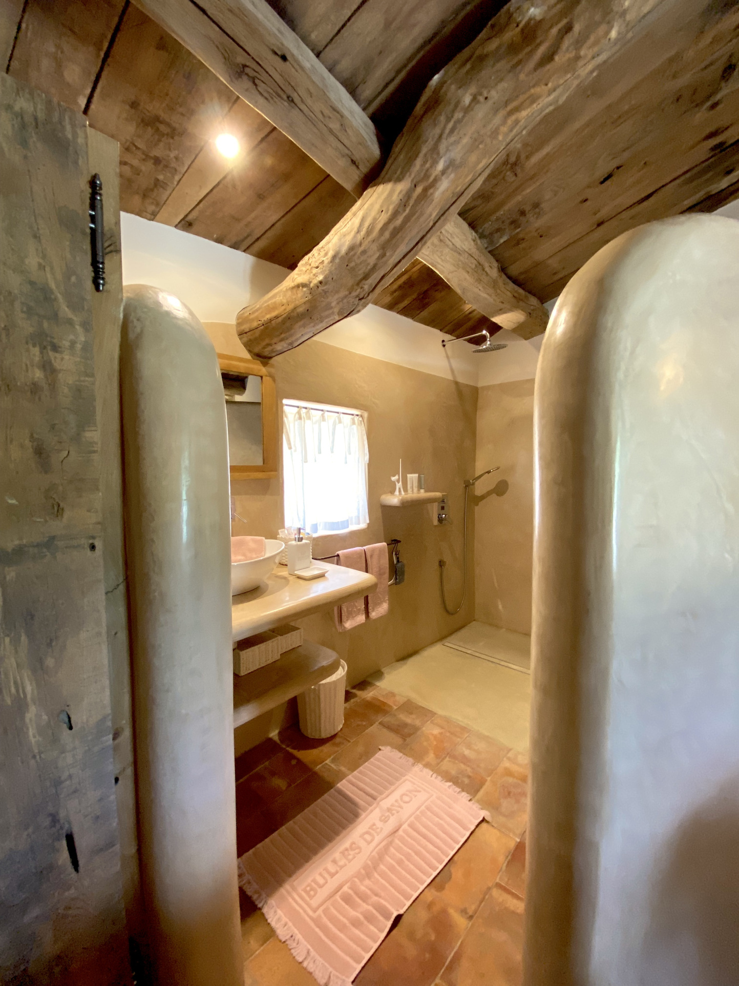Au total, quatre magnifiques chambres, chacune avec sa salle d'eau privative, toujours en terre cuite, boiseries et tadelakt, une harmonie de couleurs et de matières propice au calme et à la sérénité.